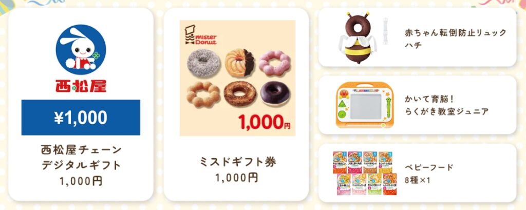 もれなく貰えるプレゼントはラインナップは4種類からと少なめですが、黄金比ビーフハンバーグやスシローお食事券等、思わず選びたくなるプレゼントが豊富で人気があります。
